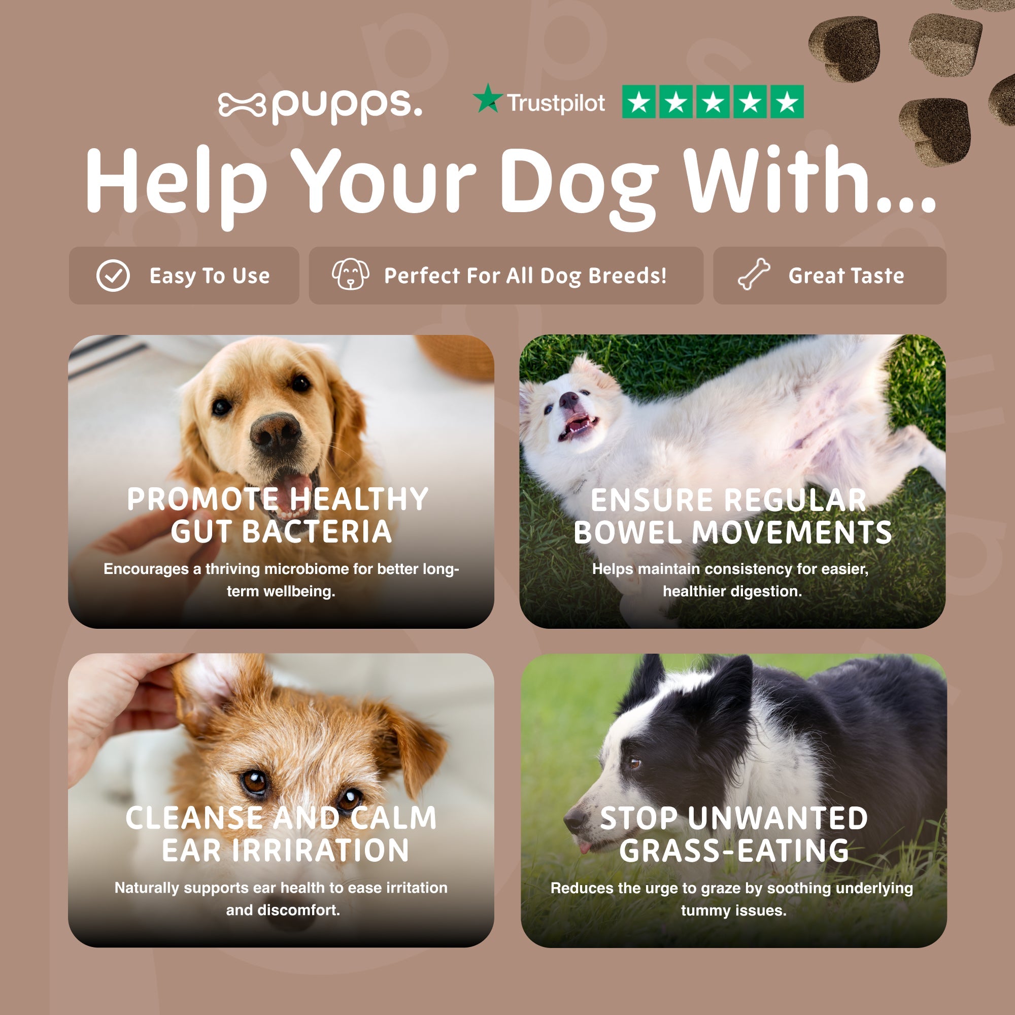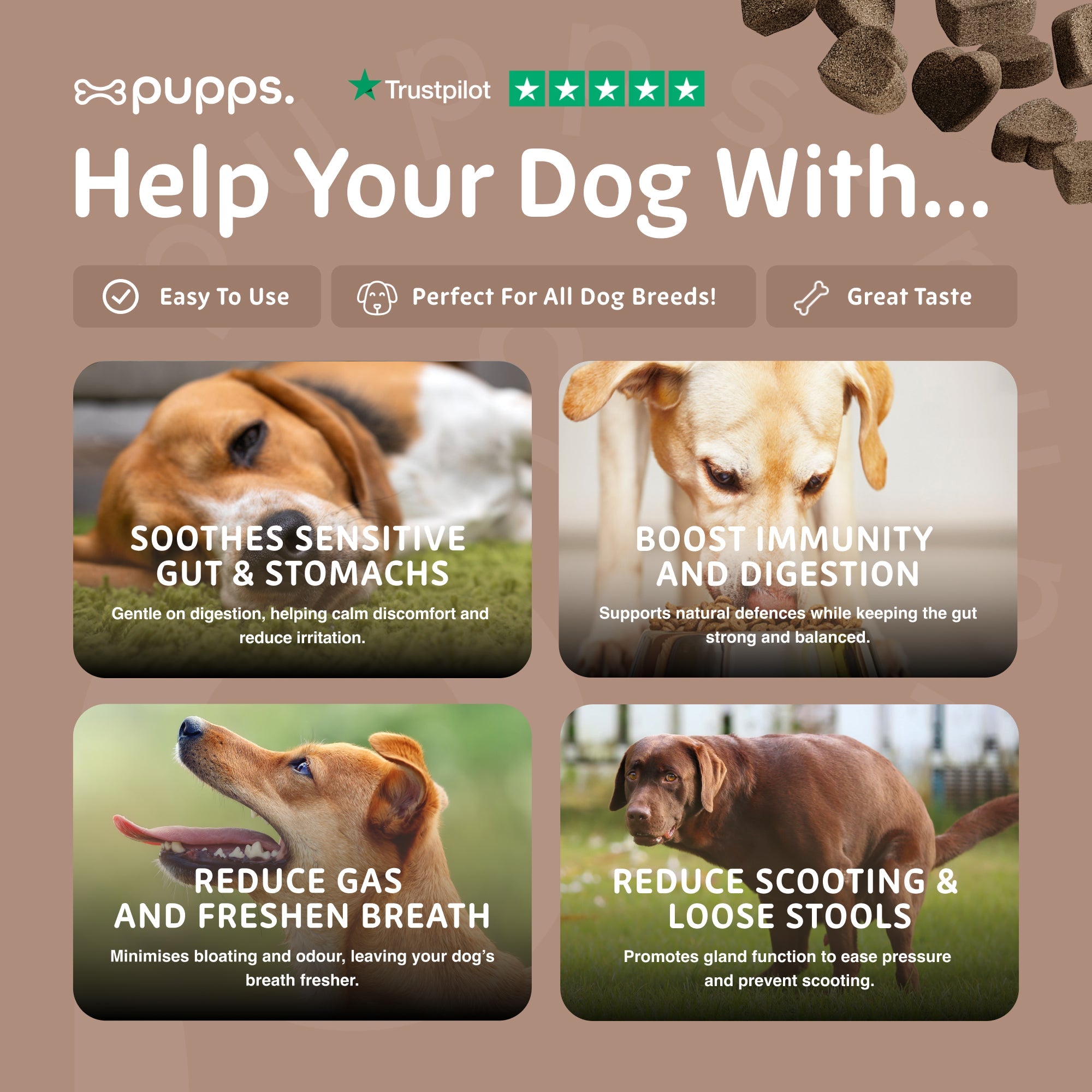 Perfect for daily use as part of a balanced diet, Pupps Pre & Probiotic Treats help keep your dog feeling comfortable from the inside out.